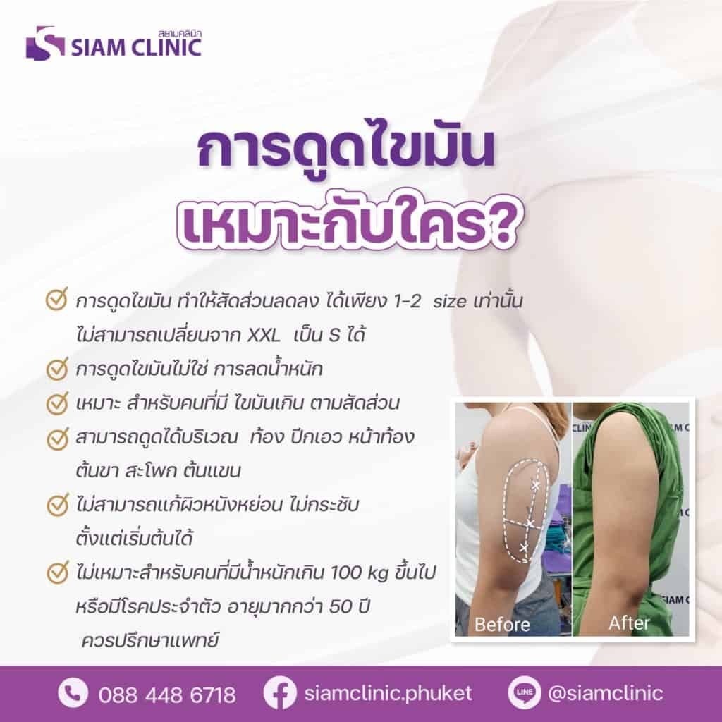 การดูดไขมัน เหมาะสำหรับผู้ที่มีรูปร่างและน้ำหนักตัวที่ปกติและต้องการจะมีสัดส่วนในแบบที่ต้องการ และมีบริเวณที่มีการสะสมของไขมันที่กำจัดได้ยากแม้จะมีการออกกำลังกายหรือควบคุมอาหารแล้วก็ตาม ซึ่งการดูดไขมันไม้ได้เป็นการรักษาโรคอ้วน