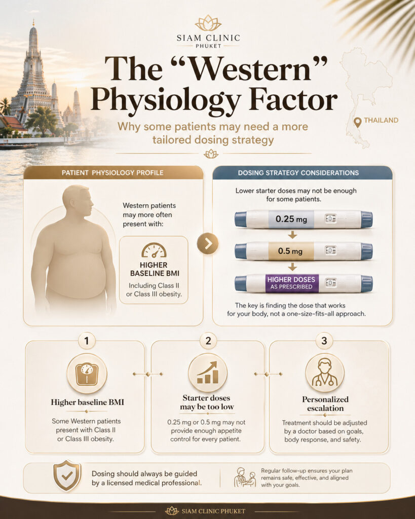 But as a Westerner, your biological needs often differ from the local population. You may have a higher baseline BMI, different dietary habits, or a need for higher dosing than the typical Thai patient.