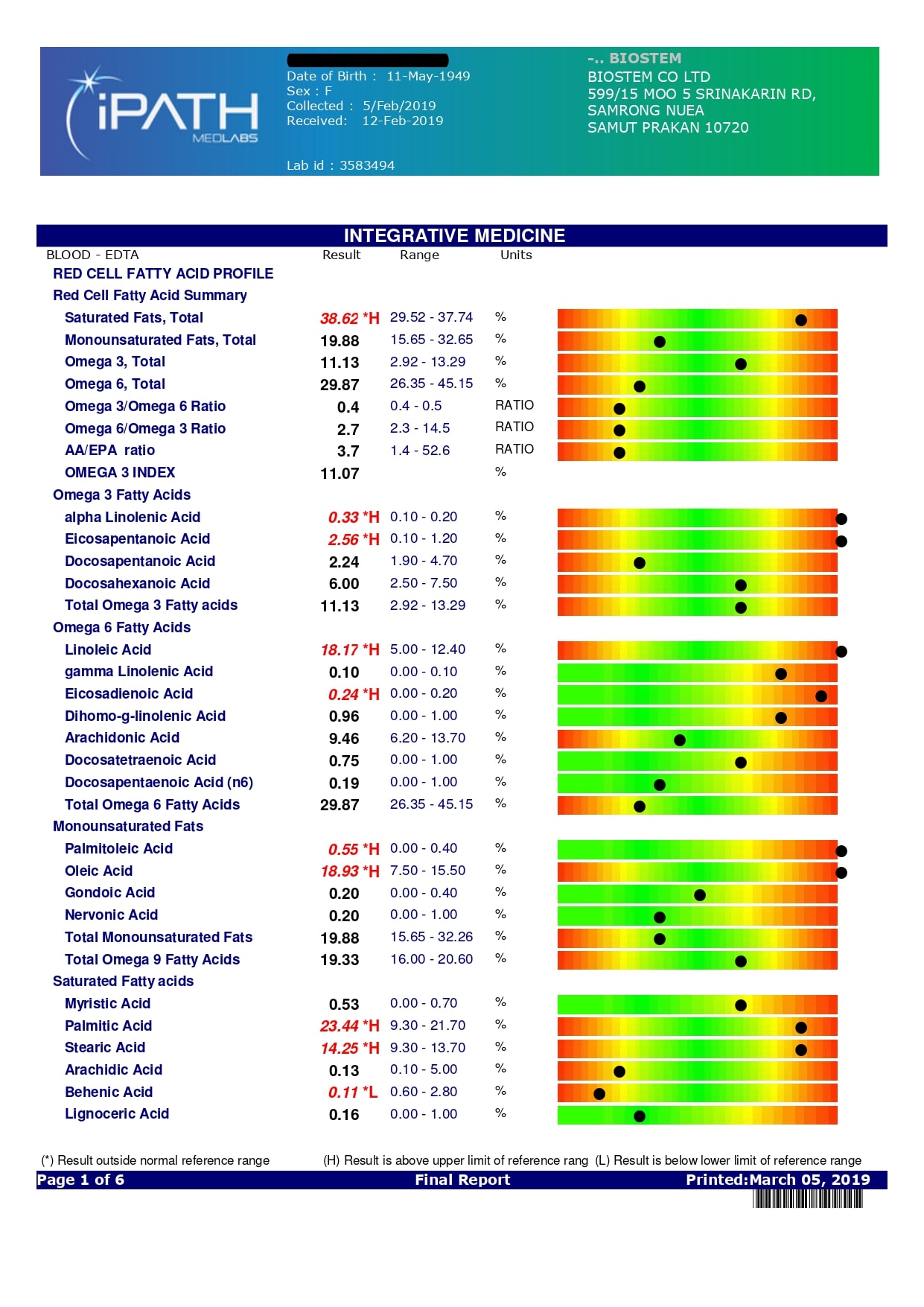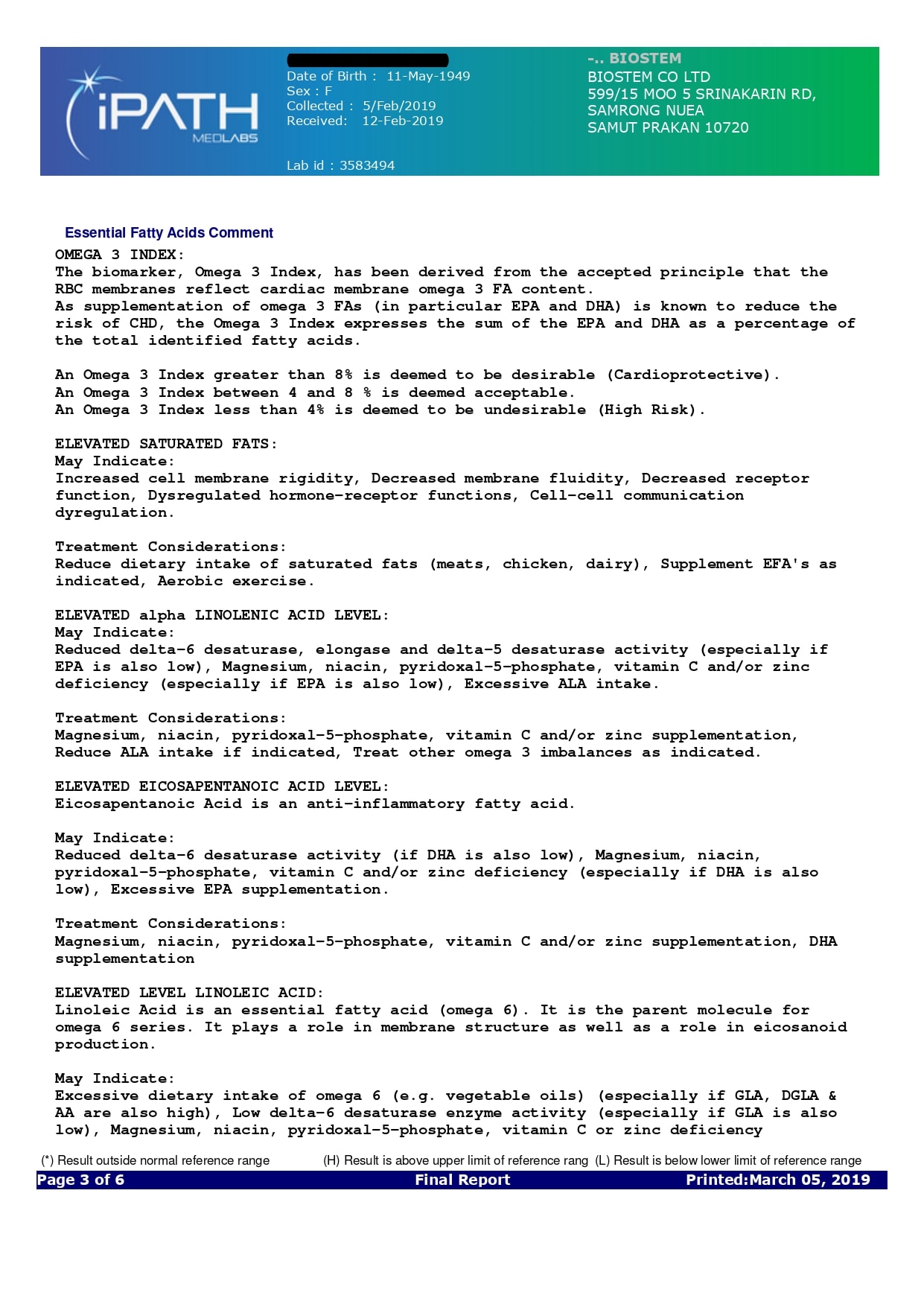 - Fatty acids such as omega-3 index, DHA/EPA, omega-6 level