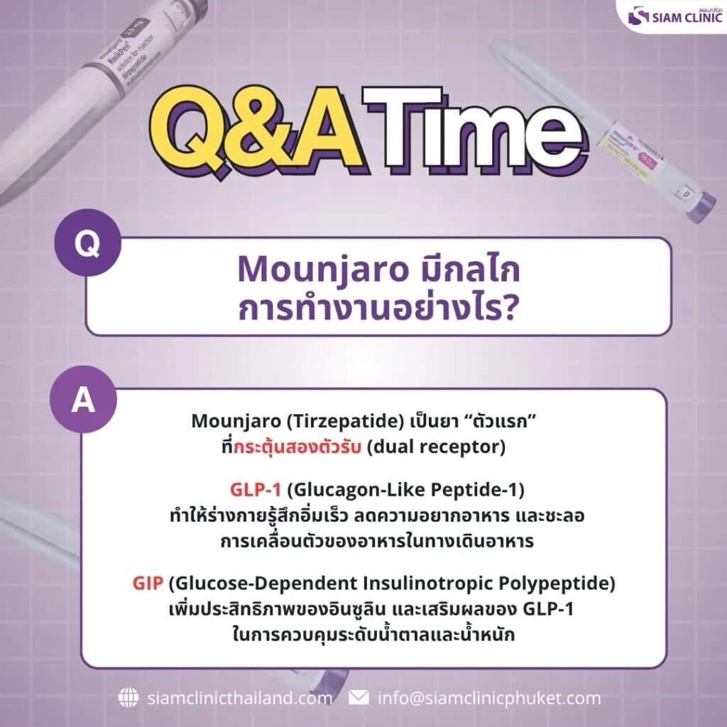 • Mounjaro (Tirzepatide) → ออกฤทธิ์ที่ 2 ตัวรับ คือ GLP-1 และ GIP receptors ทำให้ควบคุมความอยากอาหารและระดับน้ำตาลได้มีประสิทธิภาพมากขึ้น