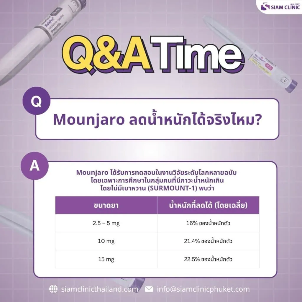 Mounjaro ได้รับการทดสอบในงานวิจัยระดับโลกหลายฉบับ โดยเฉพาะการศึกษาในกลุ่มคนที่เป็นโรคอ้วนหรือมีภาวะน้ำหนักเกินโดยไม่มีเบาหวาน (SURMOUNT-1) พบว่า