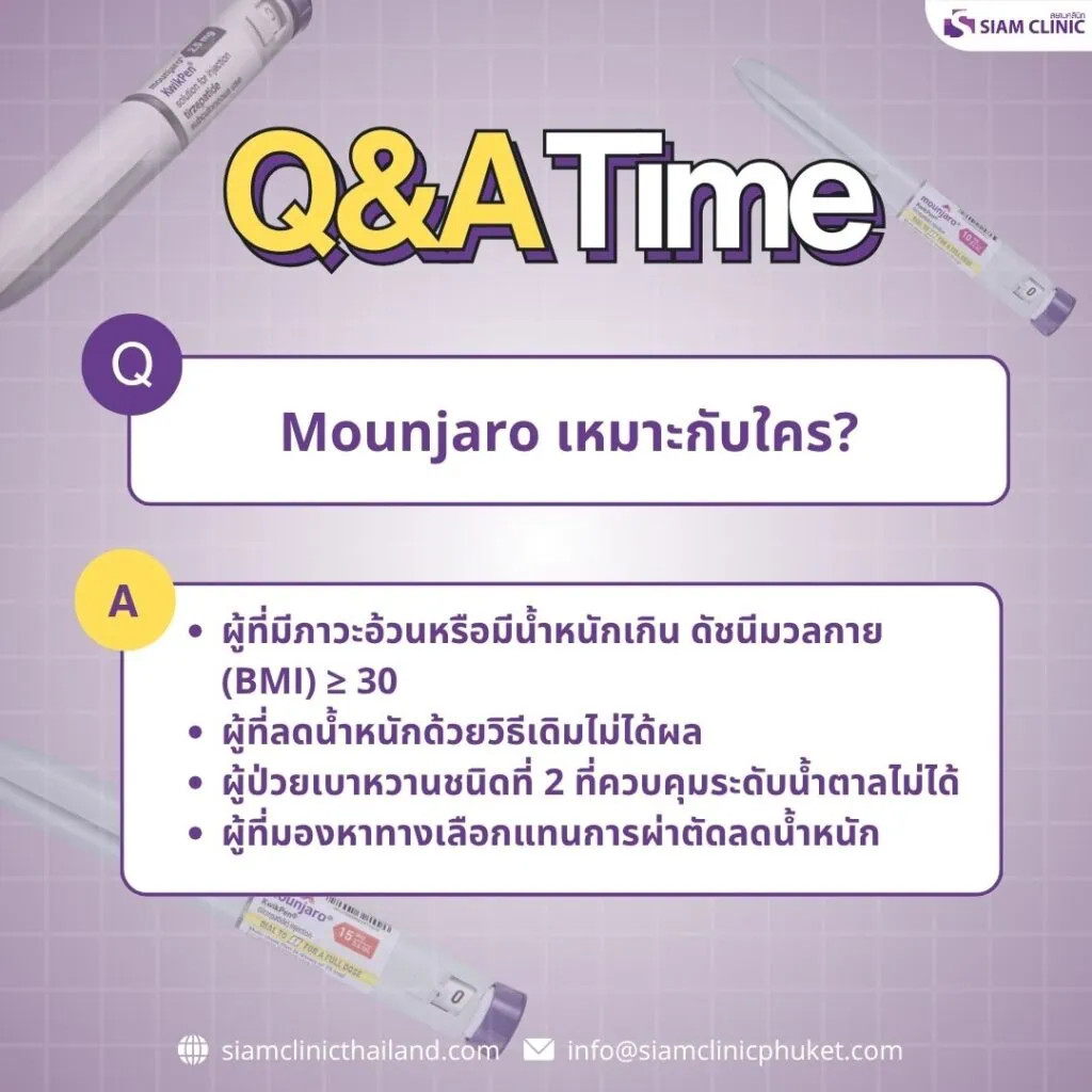 หากคุณสนใจ Mounjaro แนะนำให้ติดตามคลินิกที่มีประสบการณ์ด้านการลดน้ำหนัก เช่น Siam Clinic ในภูเก็ต ซึ่งจะเป็นหนึ่งในคลินิกกลุ่มแรกที่นำยานี้มาใช้