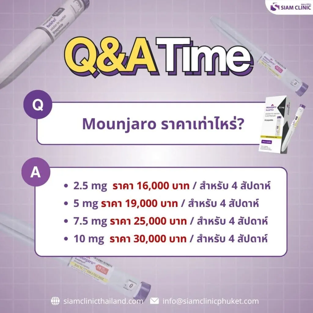 ราคาของ Mounjaro (Tirzepatide) ในประเทศไทยยังแตกต่างกันไปตามคลินิกและขนาดของยาที่ใช้ โดยทั่วไปจะอยู่ในช่วง หลักหมื่นบาทต่อเข็ม ขึ้นกับปริมาณโดสและการดูแลโดยแพทย์ผู้เชี่ยวชาญ ทั้งนี้ควรปรึกษาคลินิกโดยตรงเพื่อทราบราคาและแผนการรักษาที่เหมาะสมกับร่างกายของแต่ละคน