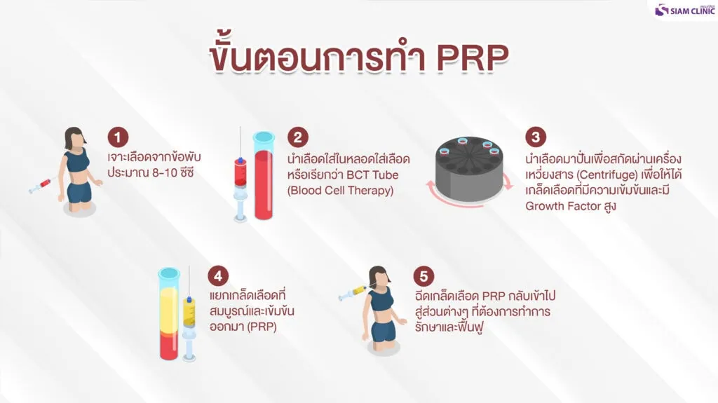เลือดจะถูกนำไป ปั่นแยกด้วยเครื่องเหวี่ยงสาร (Centrifuge) เพื่อแยกเกล็ดเลือดที่มีความเข้มข้นสูง และมี Growth Factor จำนวนมากซึ่งเป็นหัวใจหลักของ PRP