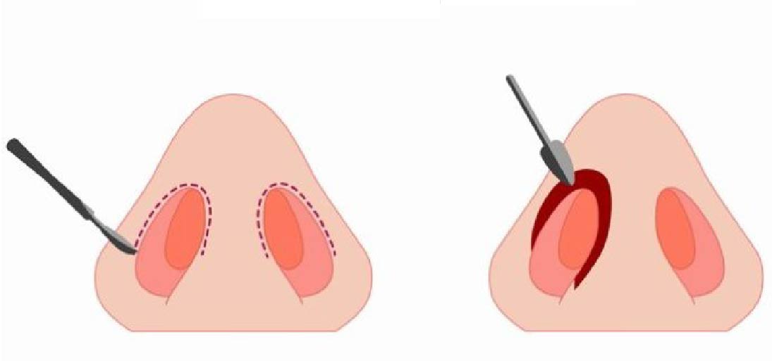 - แผลที่ด้านนอกจมูก สำหรับกรณีที่แก้ไขปลายจมูกด้วยการใช้กระดูกออกจากใบหูในการแก้จมูกสามารถทำได้ทั้งแผลด้านนอก และในรูจมูก